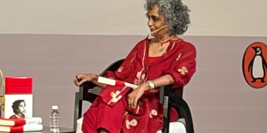 ارندھتی رائے9مارچ کو کمانی آڈیٹوریم میں اپنی کتاب پر مذاکرے کی تقریب کے دوران۔ فوٹو: دی وائر