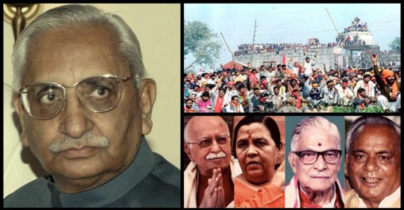 جسٹس ایم ایس لبراہن، 6 دسمبر 1992 کو بابری مسجد پر جمع کارسیوک اور معاملے میں ملزم رہے بی جے پی رہنما۔ (فوٹو: پی ٹی آئی/رائٹرس)