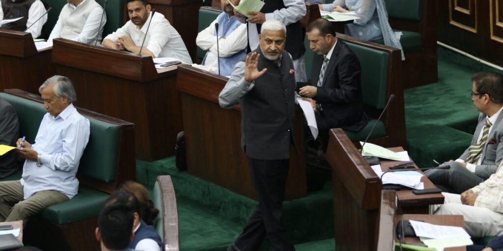 گزشتہ سال جموں و کشمیر اسمبلی سے بجٹ اجلاس کے دوران ایوان سے واک آؤٹ کر تے ہوئے بی جے پی ایم ایل اے شیام لال شرما۔ (تصویر: پی ٹی آئی)