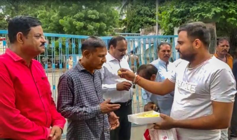 15 اگست کو مجرموں کی جیل سے رہائی کے بعد ان کا استقبال مٹھائی کھلا کر کیا گیا۔ (تصویر: پی ٹی آئی)