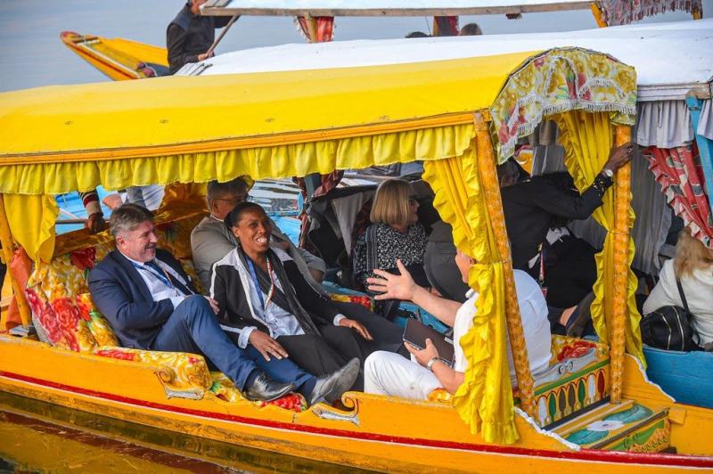 سرینگر کی ڈل جھیل میں شکارے میں یورپی یونین کے رکن پارلیامان کا وفد(فوٹو: پی ٹی آئی)