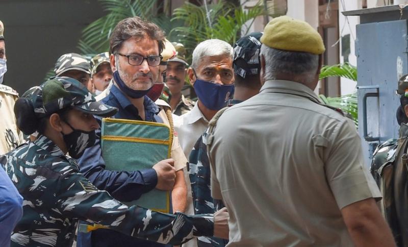 علیحدگی پسند کشمیری رہنما یاسین ملک کو بدھ کے روز دہلی کی پٹیالہ ہاؤس کورٹ میں پیش کیا گیا جہاں انہیں عمر قید کی سزا سنائی گئی۔ (تصویر: پی ٹی آئی)