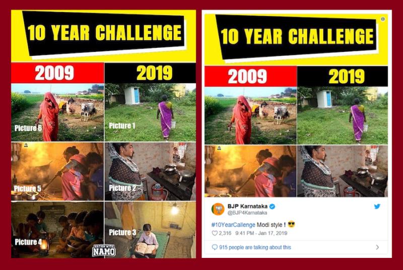 سوشل میڈیا پر 10YearChallenge# کا سلسلہ بدستور جاری ہے اور اس میں بی جے پی مسلسل فیک نیوز کی اشاعت کر رہی ہے۔ 17 جنوری کو بی جے پی کرناٹک نے ایک گرافکس شیئر کیا جس میں 6 تصویریں موجود تھیں۔ اس گرافکس میں 3 تصویروں کو 2009 کی تصویریں بتایا گیا اور باقی 3 تصویروں کو 2019 کی تصویر بتایا گیا۔ 2019 کی تصویریں بہتر حالات میں تھیں جن پر یہ دعویٰ کیا گیا کہ یہ بہتر حالات بی جے پی حکومت کی وجہ سے ہی ممکن ہو پائے ہیں۔ Social Media Hoax Slayer نے اپنی تفتیش میں واضح کیا کہ یہ تصویریں تقریباً 10 سال پرانی ہیں اور مزید یہ کہ کرناٹک سے ان میں اکثر تصویروں کا کوئی تعلق نہیں ہے۔