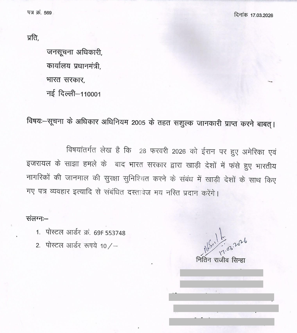 رائے پور کے رہائشی اور چھتیس گڑھ کانگریس کے آر ٹی آئی شعبے کے چیئرمین نتن راجیو سنہا نے 17 مارچ 2026 کو آر ٹی آئی ایکٹ کے تحت وزیر اعظم کے دفتر (پی ایم او) کو ایک درخواست بھیجی تھی۔