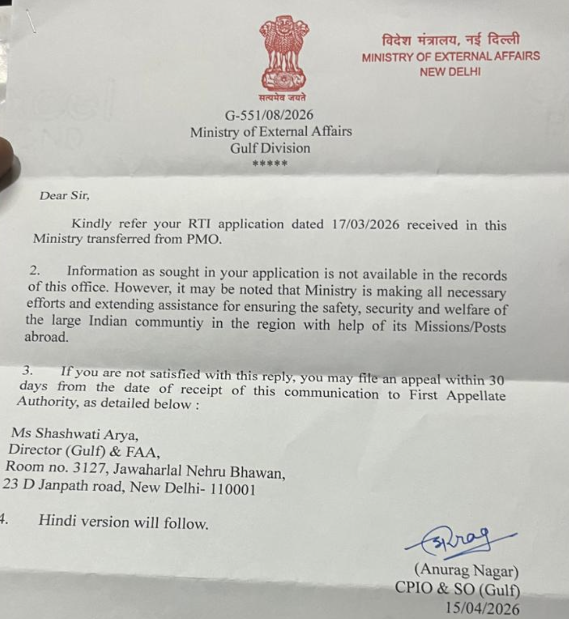 آخر کار، 15 اپریل 2026 کو وزارت خارجہ کے گلف ڈویژن کے سیکشن افسر اور سی پی آئی او انوراگ ناگر نے اس درخواست کا جواب دیا۔ اپنے تحریری جواب میں انہوں نے کہا کہ درخواست میں مانگی گئی معلومات ’اس دفتر کے ریکارڈ میں دستیاب نہیں ہے۔‘