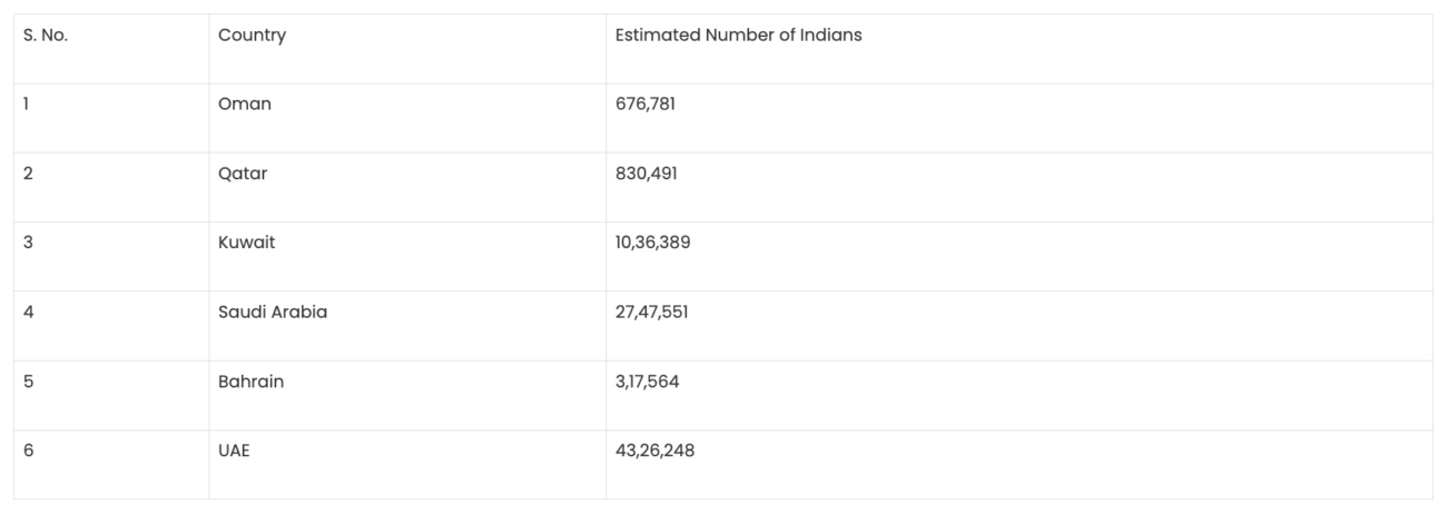 ہندوستانی حکومت نے دسمبر 2025 میں پارلیامنٹ میں بتایا تھا کہ خلیج کے کل چھ ممالک میں 99 لاکھ ہندوستانی تارکین وطن رہتے ہیں۔