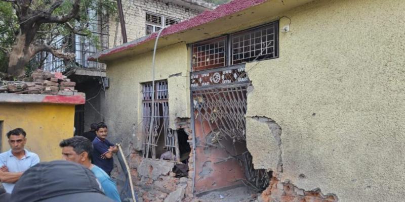 بدھ، 7 مئی 2025 کو راجوری، جموں و کشمیر کے اروان کھان یتر گاؤں میں لائن آف کنٹرول اور بین الاقوامی سرحد کے پار پاکستانی فورسز کی مبینہ طور پر رات بھر کی بھاری فائرنگ کے بعد لوگ تباہ شدہ املاک کے پاس۔ (تصویر: پی ٹی آئی)