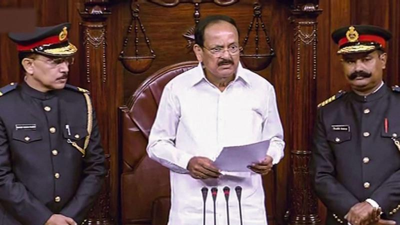 راجیہ سبھا چیئرمین وینکیا نائیڈو کے بغل میں نیا ڈریس پہنکر کھڑے مارشلز (فوٹو : پی ٹی آئی)