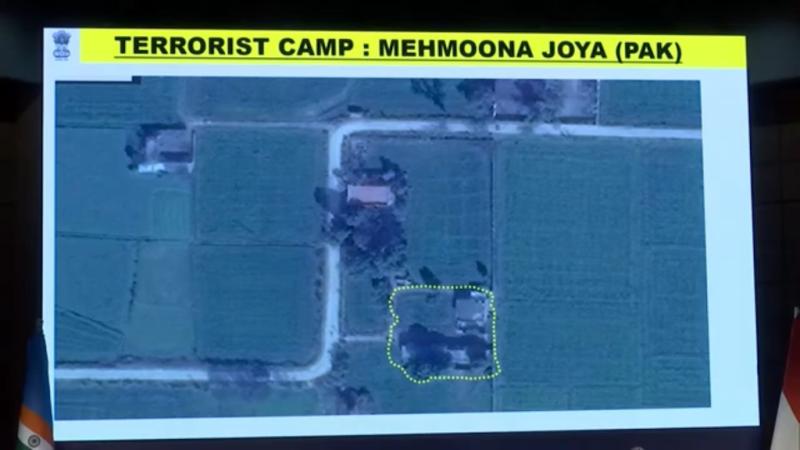 نئی دہلی میں ایک پریس کانفرنس کے دوران پاکستان میں دہشت گردی کے ایک کیمپ کا منظر دکھایا گیا، جس پر ‘آپریشن سیندور’ کے تحت حملہ کیا گیا۔ (تصویر: @MEAIndia/Youtube via PTI)