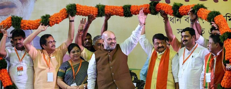 1 اکتوبر 2009 کو کولکاتہ میں ایک ریلی میں وزیر داخلہ امت شاہ کو ہار پہناتے بی جے پی رہنما(فوٹو: پی ٹی آئی)